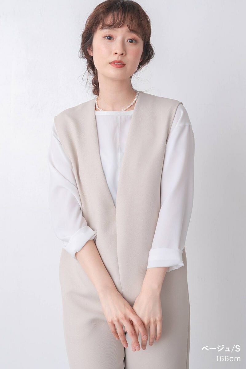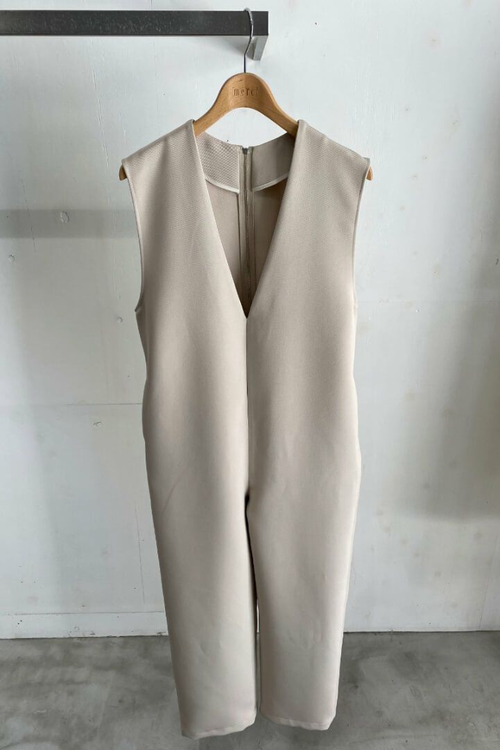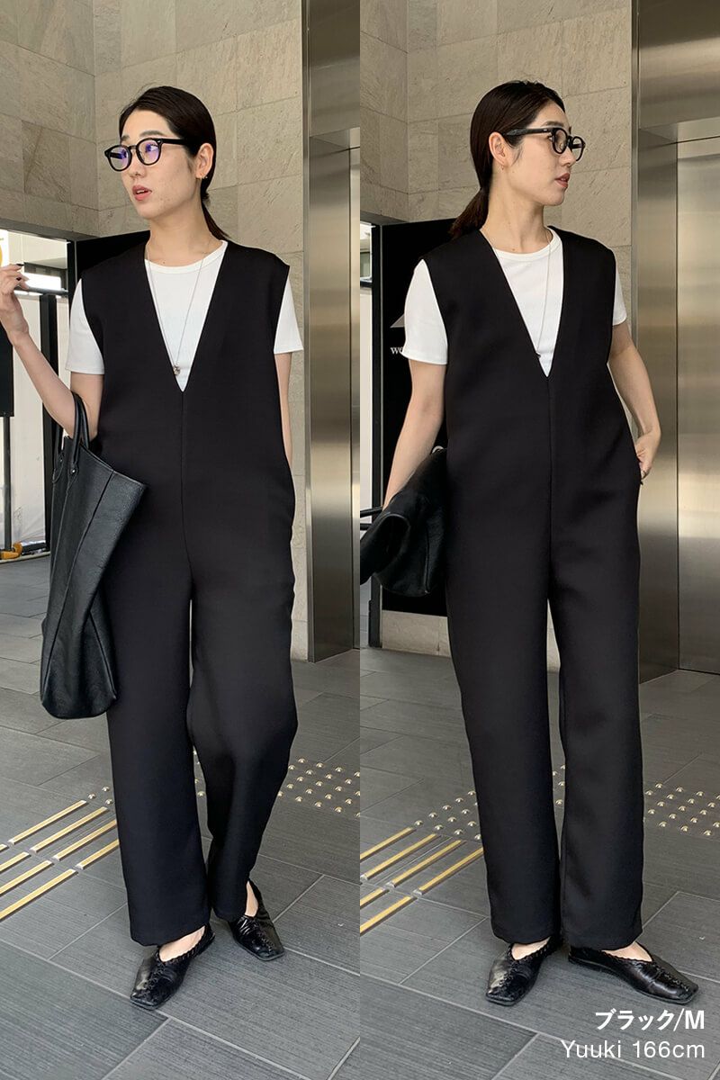 オールシーズンVネックワンピースと同生地を使用したオールインワンが完成。Vネックワンピース同様、胸元はVネック仕様でスッキリとした印象に。気膨れしにくいデザインを採用したことで、気候や気分に応じたインナーを選択でき、この一枚で多様なスタイリングを可能にしました。パンツ部分は太すぎず細すぎない絶妙なラインを追求し、スッキリ細見えする美シルエットを実現。「歩くお洒落」の登場です。