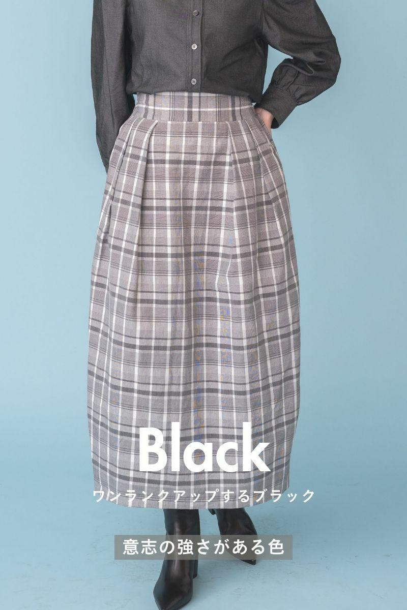 春らしい明るい色合いのチェック柄と、和紙糸を使用することで生まれる柔らかいハリ感が十分に活きるよう、やや丸みのあるコクーン型にデザインしたスカート。