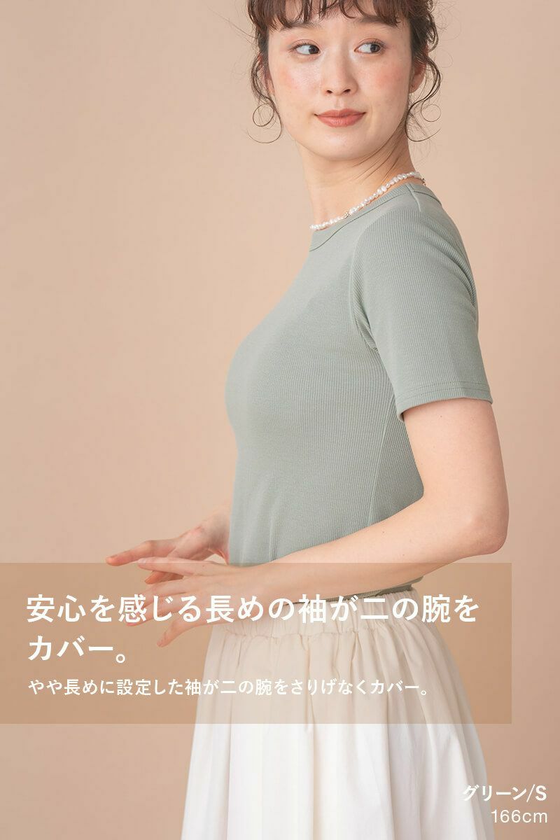 やや長めに設定した袖が二の腕をさりげなくカバーし、腕を細く見せてくれます。TEEシャツやノースリーブで二の腕が丸裸になるのは、少しづつ恥ずかしくなってきました。そんな感じたくない他人の目線は、長めの袖で、そっとしまっておきましょう。