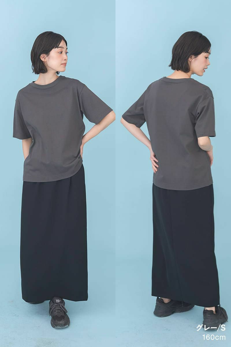 • 身幅はゆったりとした設計ながらも、膨らみが出ない生地のため着太りしない。