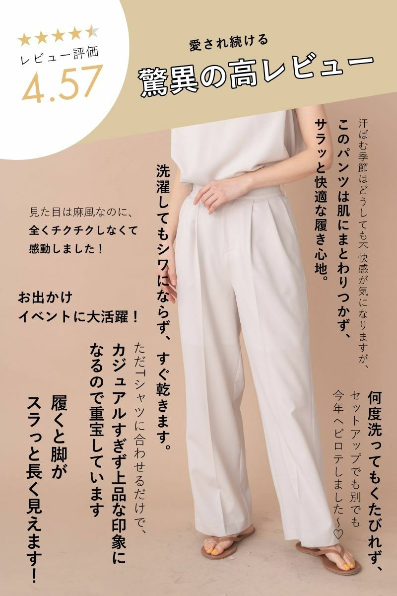汗ばむ季節はどうしても不快感が気になりますが、このパンツは肌にまとわりつかず、サラッと快適な履き心地。暑い日でもストレスなく過ごせています。