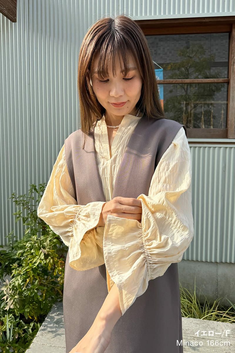 お袖がふわっとしてて可愛いです♡Vネックワンピースを上から重ねるだけでコーデが決まるので、朝の忙しい時にも迷わず着れて何度も活躍してくれます♪