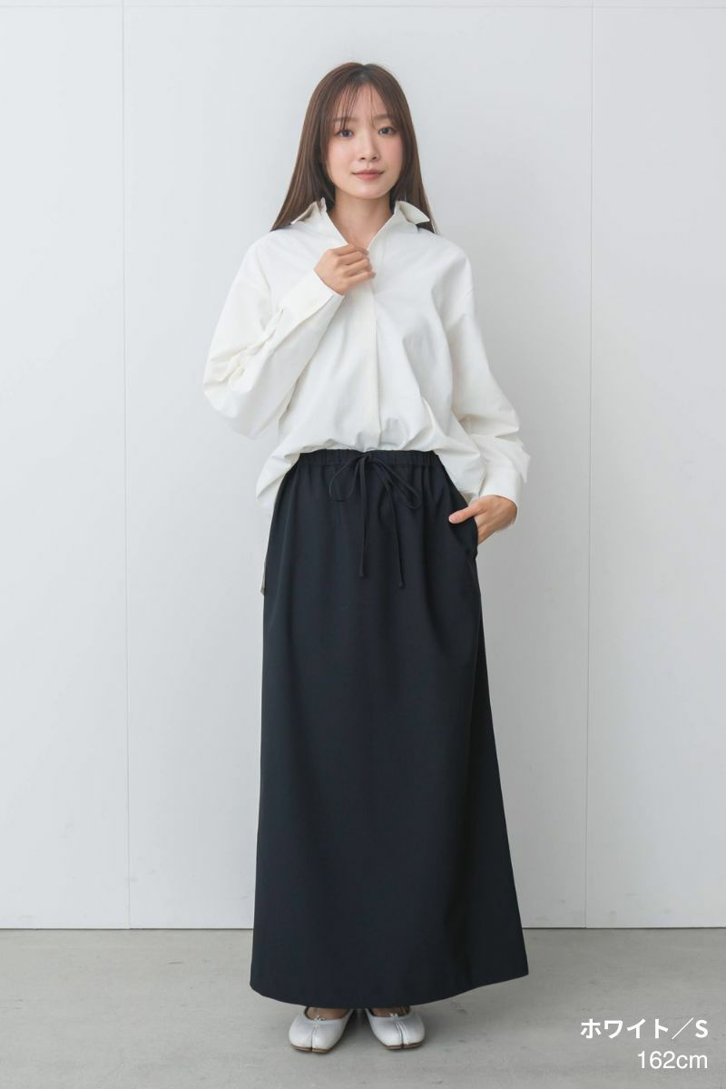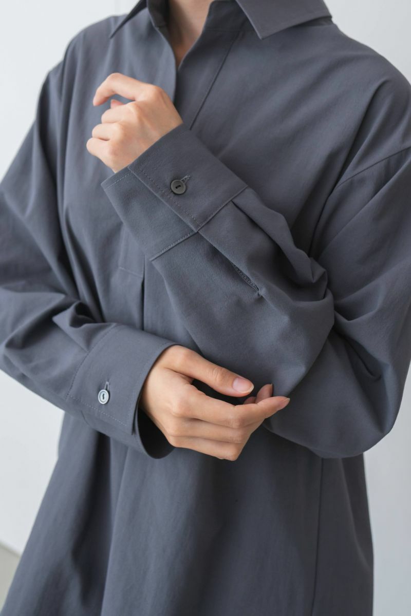 オーバーシルエットで仕上げたスキッパーシャツは、ゆったりとした身幅と肩の落ち感を意識して設計しました。