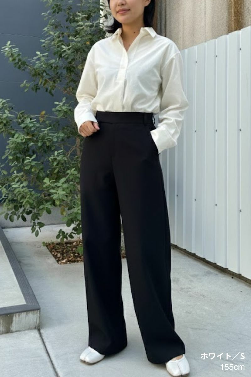 少しタイトめなボトムスと合わせると、ふんわりした自然な抜け感が目立ち、ゆったりとしたボトムスに合わせると、顔周りをスッキリ見せてくれる全体的な柔らかさが目立ちます。