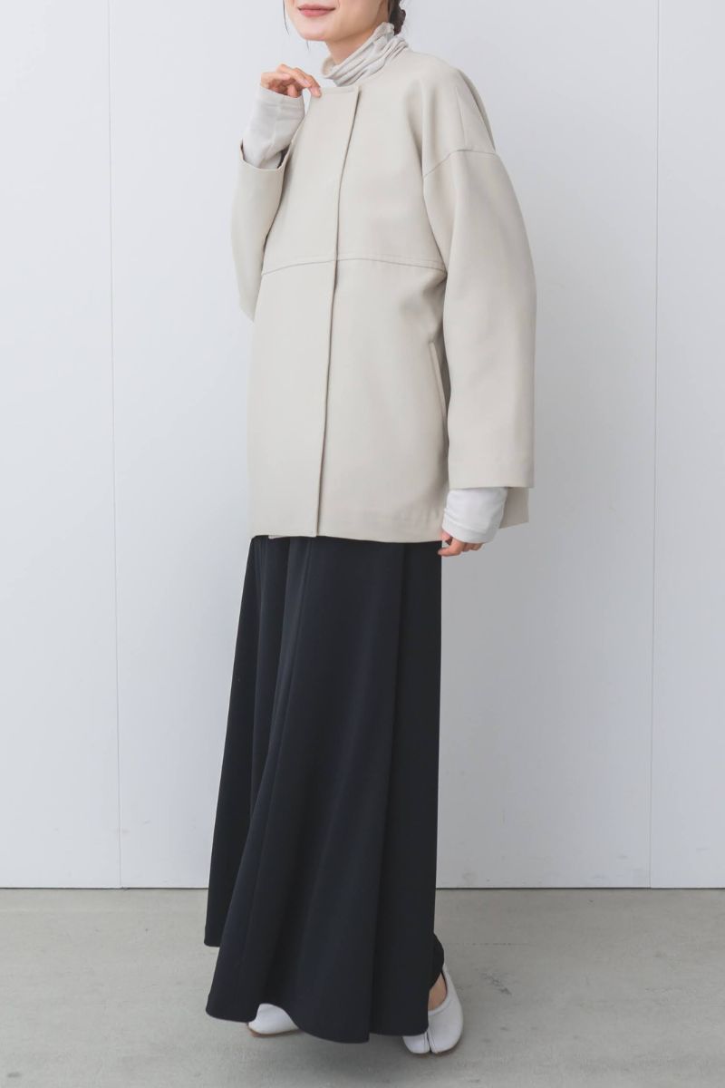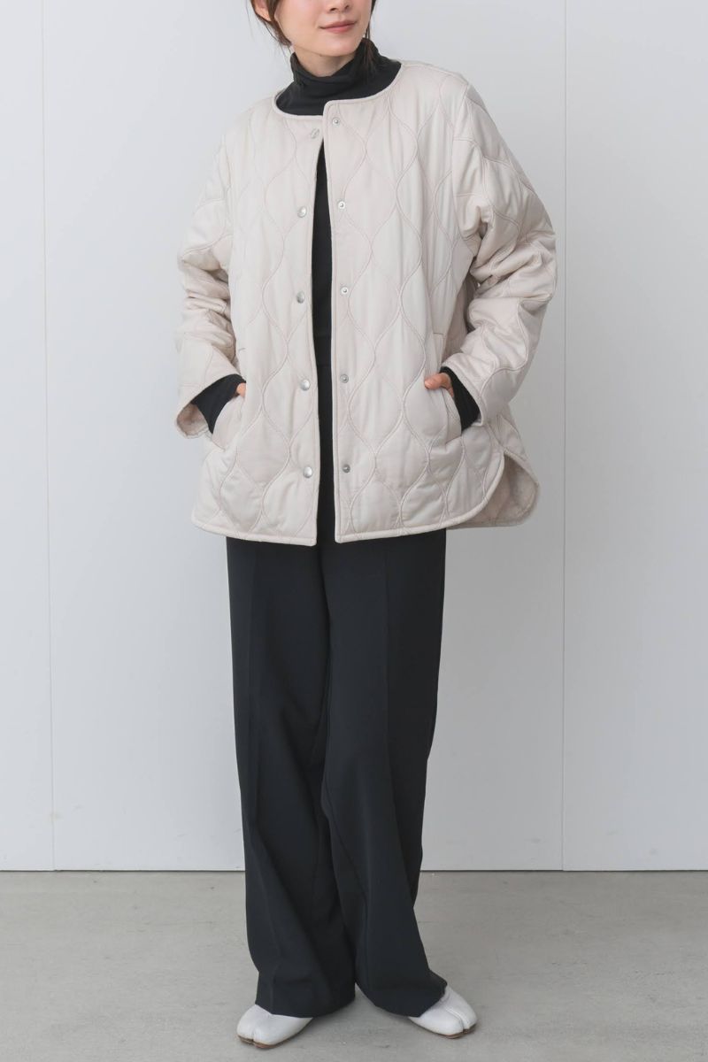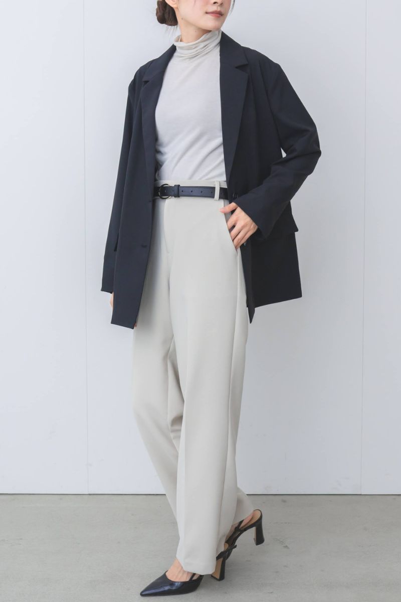 リッチタートルの上に、軽くて洗えるノーカラーアウターを重ねて、