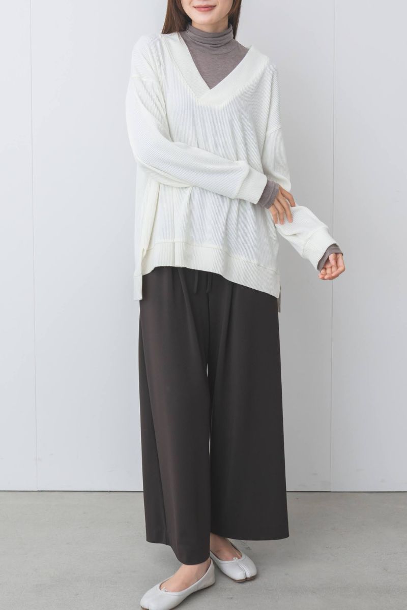 保温素材のVネックカットソーに、ブラウンのリッチタートルを重ねて、