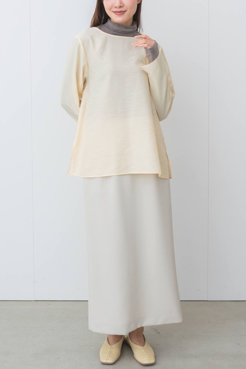 シアー素材のイエロートップスに、ブラウンのリッチタートルを重ねることで、