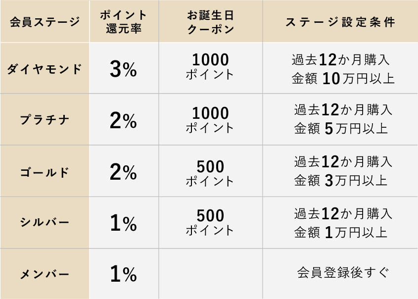 ご購入金額にあわせて、初回購入日から1ヶ月おきに会員ステージが変動します。